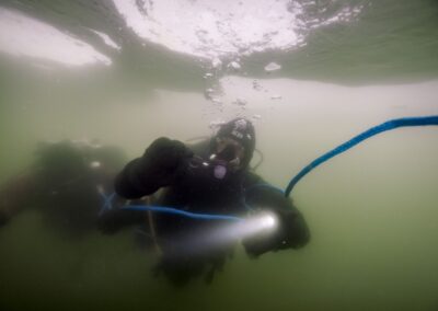 |  | Eistauchen ist ein Taucherlebnis der besonderen Art und birgt viele Risiken. In diesem Kurs lernst Du in Theorie und Praxis die sichere Planung, Vorbereitung und Durchführung von Eistauchgängen und kannst anschließend u.a. örtliche Gegebenheiten für Eistauchgänge oder auch besondere Probleme und Gefahren bei Eistauchgängen einschätzen und beherrschen. Außerdem kennst Du die Anforderungen an die Ausrüstung für Eistauchgänge, den Umgang mit der Leine und kannst sie auch anwenden. Nach erfolgreicher Teilnahme erhältst Du die offizielle Lizenzkarte sowie einen Einkleber für den Taucherpass.