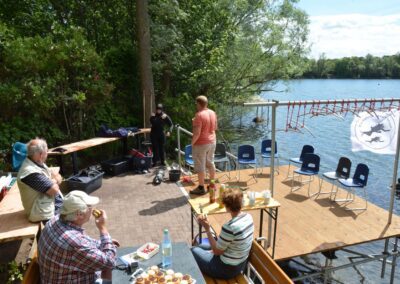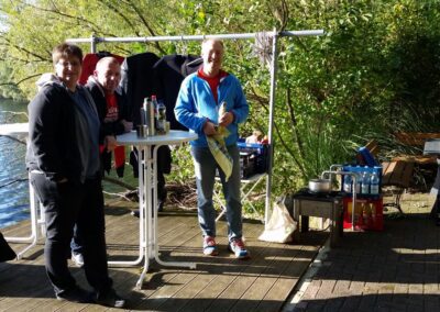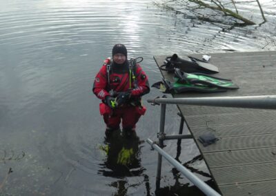 Unser Einstieg ist direkt an der Straße Am Weilerhof (Anfahrt Bösinghovener See). Dort wird am Straßenrand geparkt (bitte Mitgliedsausweis sichtbar hinter die Autoscheibe legen). An dem Einstieg befindett sich ein Holzsteg, sowie Rödeltische und eine Stange um die Ausrüstung zu trocknen.