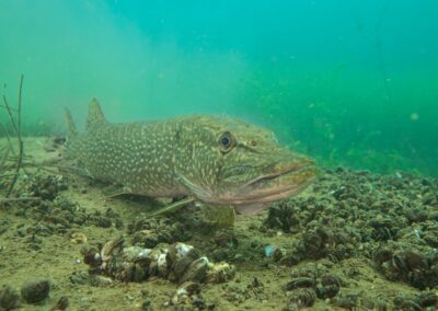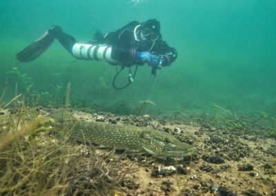 Es gibt hier viele Weissfischarten, Zander, Barsche, Hechte, Aal und sogar Welse. Auch Krebse und Schleien wurden bereits gesichtet. Wir teilen uns den Einsteig mit den Meidericher Tauchern und sind auf dem Gelände des SLS. Hier wird eine Zugangskarte für die Zufahrtsschranke benötigt, die gegen Pfand erworben werden kann. Der Zugangsschlüssel der Seen wird benötigt um das Tor zum Einstieg zu öffnen.