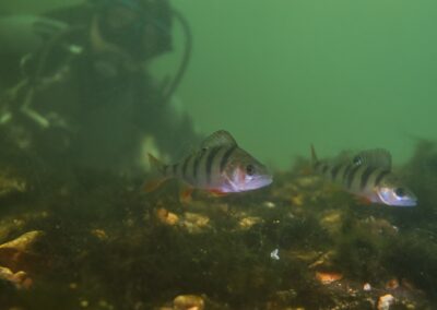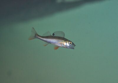 In dem Baggersee gibt es verschiedene Fischarten zu sehen: Hechte, Zander, Karpfen, Aal, Barsche, Rotaugen und Krebse.